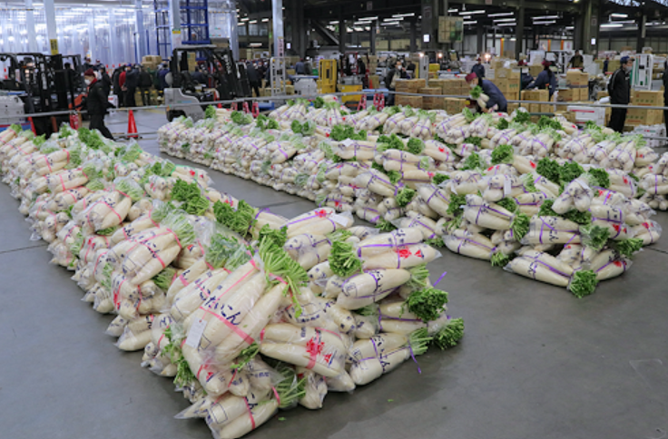 当社は青果棟に入居しており、市場に搬入された大量の冬野菜が並ぶ様子や、箱が積み上げられる通路を毎日のように目にしています。